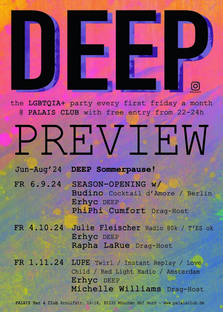 Das gilt im Übrigen auch fürs kommende Programm bei Deep. Wir spoilern schon mal ein bissl: Im Oktober wird neben Erhyc auch Julie Fleischer, einigen bekannt von Radio 80000, hinter den Decks stehen. Weiter vorne im Rampenlicht wird sich währenddessen Rapha LaRue als Drag-Host des Monats präsentieren.