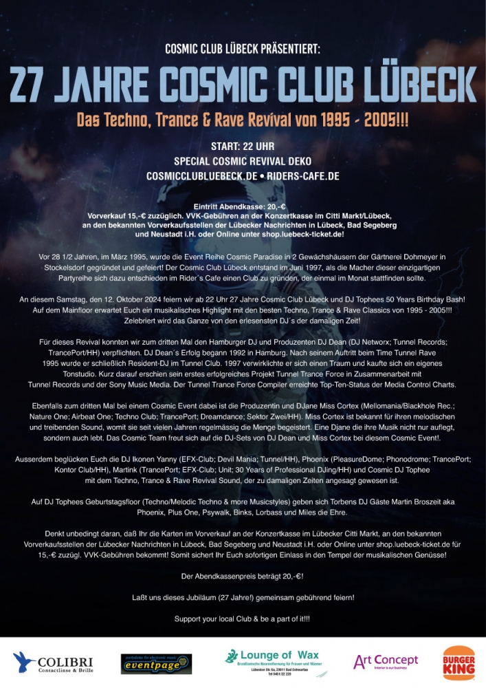 Vor über 29 Jahren, im März 1995, wurde die Event Reihe Cosmic Paradise in zwei Gewächshäusern der Gärtnerei Dohmeyer in Stockelsdorf gegründet und gefeiert! Der Cosmic Club Lübeck entstand im Juni 1997, als die Macher dieser einzigartigen Partyreihe sich dazu entschieden im Rider´s Cafe einen Club zu gründen, der einmal im Monat stattfinden sollte.