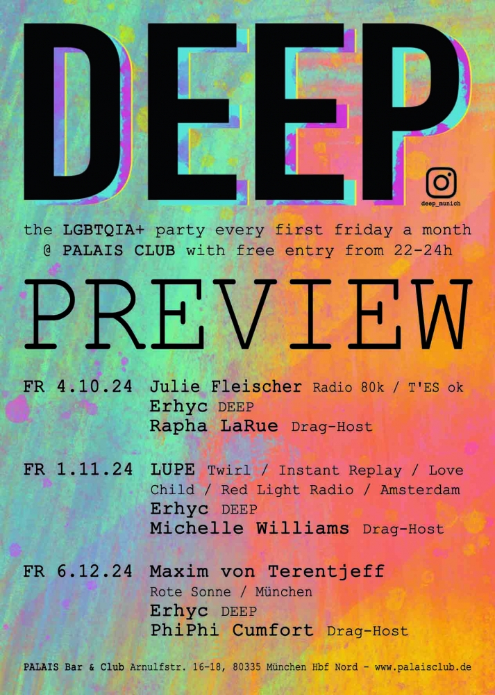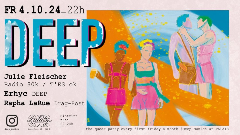 DEEP erklimmt im Oktober die nächste Stufe auf dem Weg nach oben und zaubert der regenbogenbunten Community wieder ein dickes Lächeln ins Gesicht. Um die gewohnt technoiden Tracks, die für geschmeidige Verrenkungen auf dem Parkett sorgen, kümmern sich diesmal Julie Fleischer und natürlich DEEP-Gas(t)geber Erhyc. Julie begeisterte vor ein paar Wochen erst bei der Italomania-Party vom Label Toy Tonics, sie hat den Dreh und den Drive einfach raus und wird das auch bei DEEP zeigen. Erhyc wiederum kennt seine Crowd und wird sie doch gnadenlos überraschen. Denn den Sommer über hat er seine Tracklist kräftig durcheinandergewirbelt und wird allen ein frisches Best-of um die Ohren hauen.