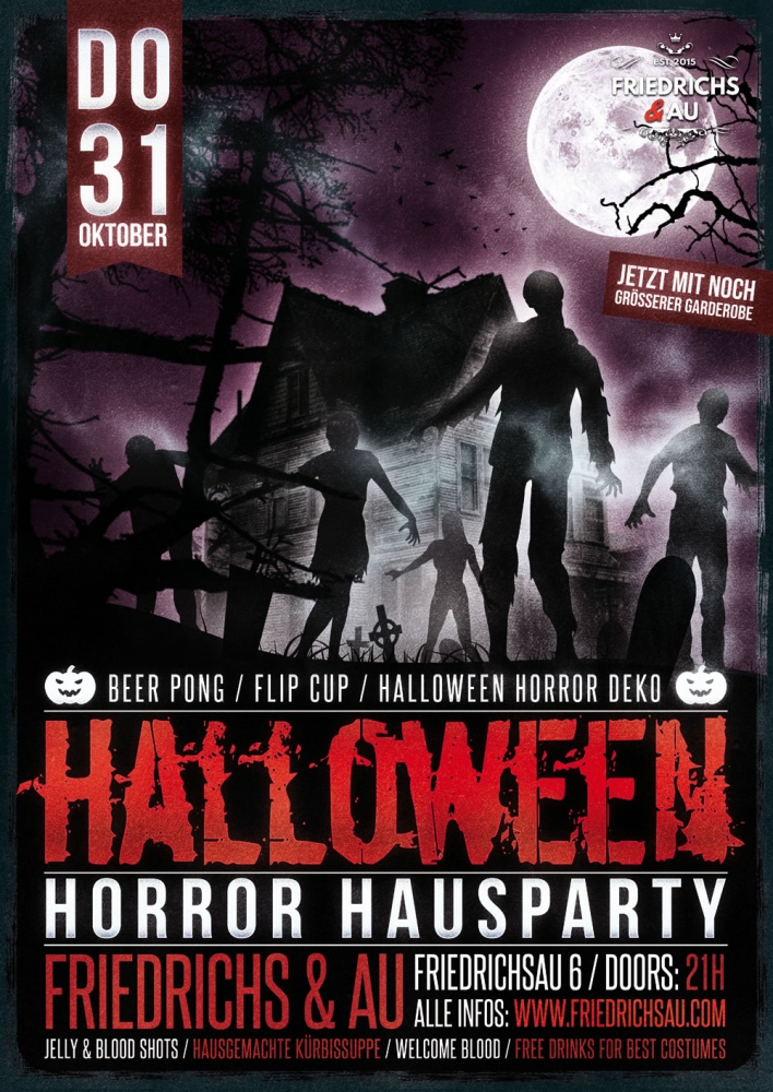 Natürlich sind alle so willkommen, wie sie gern feiern möchten, mit Kostüm gibts aber am Eingang schonmal einen ersten Blood Shot umsonst! Freut Euch auf Blood & Jelly Shots, viele zu Halloween angepasste Getränke, einer gruseligen Halloween Deko, Halloween Visuals, die das gesamte Friedrichs & Au in eine schauerige Halloween Atmospähre tauchen und die wohl gruseligste Studentenparty zu Halloween!