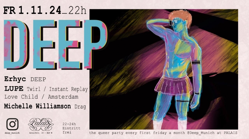 An Allerheiligen kann die queere Münchner DEEP-Community in persona von DJ/Producer Lupe erstmals eine Schlüsselfigur des holländischen Nachtlebens genauer unter die Lupe nehmen. Der Amsterdamer zeigt sich soundtechnisch inspiriert von Acid House und Disco und lebt zugleich die Grundwerte der elektronischen Musikszene – Frieden, Toleranz und Respekt – vorbildlich vor. Seine Maxime: Tanzabende für alle Identitäten zu schaffen, für Männer und Frauen, Heteros und Schwule, Schwarze und Weiße und so weiter. Für Lupe ist das Nachtleben genau der richtige Ort, um Unterschiede im täglichen Leben zu überwinden und um sich frei in einem neuen Licht sehen zu können.