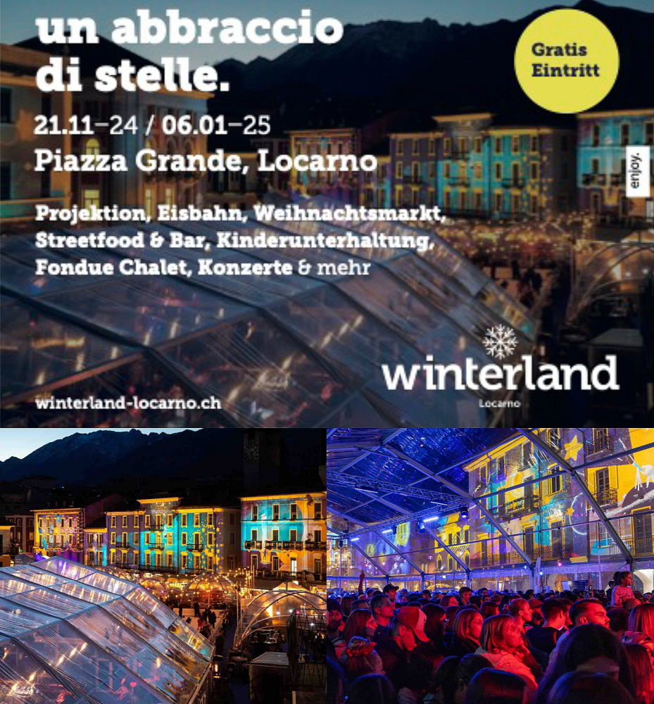 Locarno ist vom 21. November 2024 bis 6. Januar 2025 Schauplatz des «Winterland»: Die Besuchenden aus der ganzen Schweiz können hier den Zauber des Winters mit spannenden Erlebnissen und Aktivitäten für jeden Geschmack erleben– Eisbahn, Kamikice, Karussell, Konzerte, Weihnachtsmarkt und verschiedene gastronomische Angebote. In 25 malerischen Häuschen werden Kunsthandwerk, Weihnachtsschmuck, Geschenkideen und kulinarische Köstlichkeiten angeboten. «Winterland» ist auch ein audiovisuelles Spektakel, das auf die malerischen Fassaden der Piazza Grande projiziert wird. Unter den Sternen erwartet die 300 000 Besuchenden eine Winterwelt voller Spass und Magie. 2024 heimste der Event den Xaver-Award in der Kategorie «Public Event» ein.