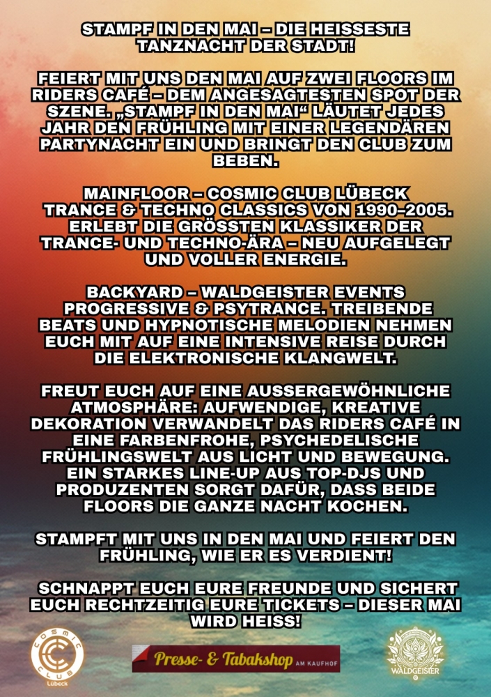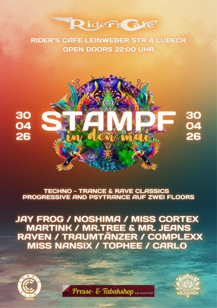 Die legendären Rider´s Cafe Clubs Cosmic Club Lübeck und Waldgeister Events präsentieren euch zusammen mit dem Rider´s Cafe am 30.04.26, ab 22 Uhr, auf zwei Floors die ultimative Stampf in den Mai Party im Lübecker Rider´s Cafe.