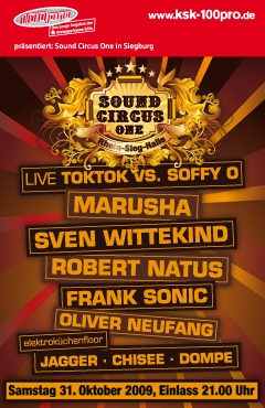 Sound Circus One seine Pforten in der Rhein-Sieg-Halle und lädt alle Partybegeisterten zur größten elektronischen Party in der Region ein. Der Soundcircus steht für Energie, für Leidenschaft und die Liebe zur Musik. Auf zwei Dancefloors werden namhafte DJ?s aus ganz Deutschland die Rhein-Sieg-Halle bis in den Morgen in einen brodelnden Hexenkessel verwandeln. Treibende Beats und ein aufwändiges Lichtkonzept lassen die Besucher in eine andere Welt tauchen und die Nacht zum Tag werden.