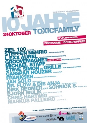 Als kleines Geschenk erhalten die ersten 150 Partygäste an diesem Abend eine Mix-CD mit speziellen DJ-Sets der Toxic Family Künstler.