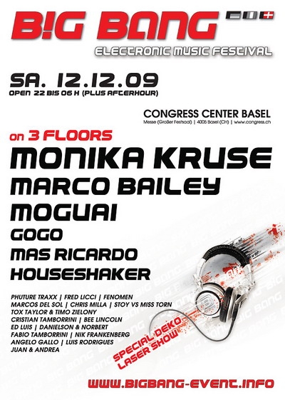Am Sa. 12.12.2009 steigt in der Messe Basel / Kongresscenter das erste elektronische BIG BANG-Musikfestival in der Schweiz. Freut euch auf internationale Topacts wie Monika Kruse, Marco Bailey und Moguai, unterstützt von national bekannten Schweizer Star-Djs wie u.a. Gogo, Mas Ricardo und natürlich zahlreichen Djs aus Basel und dem gesamten Dreiländereck D - F - CH! Das alles auf drei verschiedenen Floors (Mainfloor: Techno & Minimal; House- & Progressive-Floor; Electro- & Tekhouse-Floor), geöffnet ist von 22 bis 06 h. Organisiert wird dieses Eventhighlight von den Firmen nitebeats events bzw. FRB Diskothek Südbaden GmbH aus Deutschland, welche die BIG BANG Eventreihe seit Jahren erfolgreich in Süddeutschland + auch in Frankreich durchführen, sowie von Noches con Sol und der 5hot7 Eventagentur aus Basel. Nach mehr als 30 durchgeführten Big Bang Events u.a. in der national bekannten Diskothek Universal D.O.G. in Lahr (Süddeutschland), der Riegeler Brauerei sowie dem Centennials Club auf dem alten Militärgelände in Lahr und der erfolgreich positionierten Big Bang France (Strasbourg) gastiert die Big Bang Eventreihe am 12.12.09 zum ersten Mal in der international bekannten Messe Basel! Die Räumlichkeiten der Messe Basel überzeugen mit einer komfortablen Ausstattung. Die Mischung aus Infrastruktur, Besucherkapazität und Flexibilität in der Ausgestaltung der einzelnen Veranstaltungen mit variablen Möglichkeiten in Raumaufteilung und Dancefloor-Gestaltung u.a. mit verschiedenen Visuals wie Laser- & Videoprojektionen machen den Grossen Festsaal der Messe Basel zur idealen Lokalität für ein Projekt wie die Big Bang.
