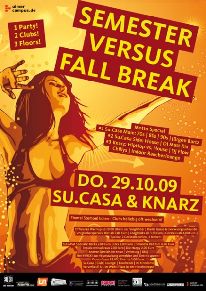 Der Unialltag hat an Uni und Fachhochschulen Einzug gehalten, doch für die Schüler gibt es eine Woche zum Durchatmen: Die Herbstferien! Grund genug, wieder einmal gemeinsam zu feiern! Das Team von ulmercampus.de lädt Euch am 29.10.09 ab 23:00 Uhr zu Semester versus Fall Break Party ein - hier wird bis zum Morgengrauen gefeiert! Auf 2 Floors könnt Ihr wieder richtig abrocken: #1 Su.Casa Main: House, HipHop, Party, Charts, Electro mit Eddi Arndt - wer ihn schon einmal auf einer Uniparty erlebt hat, hat gesehen, wie der Floor buchstäblich auseinander genommen wird! #2 Su.Casa Side: HipHop, RnB, Black und Electro mit DJ Chrizzly! Natürlich wird auch der studentische Geldbeutel geschont: Becks, Oxx, Die Happy und Tequila Shots gehen für unschlagbare 2,00 Euro über die Theke, Finlandia Red Bull ist für nur 4,50 Euro zu haben! Riesen Verlosung! Der Eintritt für dieses Highlight im Herbst beträgt nur mager 5,00 Euro! Vorverkauf im U1 im Wöhrl Plaza in der Hirschstrasse! Lasst Euch diese Party nicht entgehen! Party on!