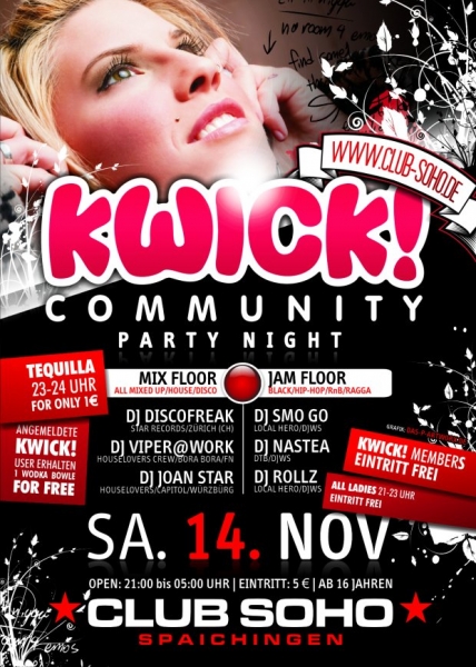 Die gebuchten DJ TURNTABLE-ROCKER werden nicht nur die KWICK! USER FAMILY zum Arschwackeln bringen...auch die regionalen Partypeoples sind zur ultimativen CLUBBING NIGHT geladen.