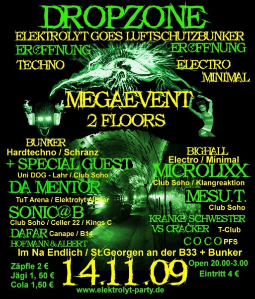 Unser neuer Hardtechnofloor (Dropzone) befindet sich in einem alten Luftschutzbunker 10 Meter unter der Erde. Hier legen unsere Top DJ´s Sonic@B und Joy-Stella im Battle mit Da Mentor richtig auf. Die tanzwütige Masse wird aufgewärmt von DJ Dafar und DJ Hofmann & Albert.