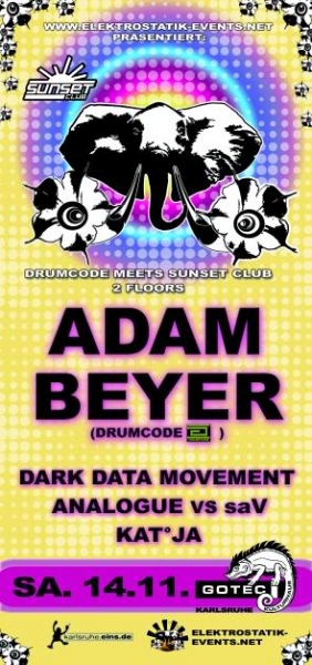 Ein weiterer Superstar erwartet die Besucher des Sunset Clubs: Mit dem Drumcode-Head und Schwedens Export-Schlager Nr. 1 ADAM BEYER hält ein ganz Großer Einzug ins Gotec. Nicht nur als Chef des schwedischen Drumcode Label weiß ADAM BEYER zu überzeugen, auch sein cooler druckvoller und kräftiger Minimal-Techno weißt eine ganz individuelle Handschrift aus: Eine Handschrift, die für den Sound von ADAM BEYER steht, auch bekannt als ?Techno-Sound of Sweden?. Wir hoffen alle sehr, dass nach seinem Auftritt das Gotec noch stehen wird, denn das ist nicht selbstverständlich. So manche Wand hat aufgrund seiner fetten Bässe schon Risse bekommen!
