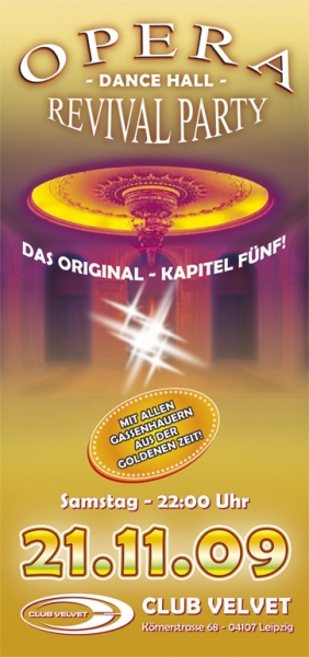 Ja, ein weiteres Jahr ist in die Lande gezogen, was für uns und euch heißt, die gut gepflegten Rave- Klamotten endlich wieder aus dem Schrank zu holen. Zum Erstaunen unserer selbst, geht unser alljährliches OPERA Revival Happening schon in die fünfte Runde. Nachdem wir im letzten Jahr im Volkspalast gastierten ? wo das Partythema mehr als nur ansatzweise aus den Augen zu verschwinden drohte ? haben wir uns in diesem Jahr für das wohlige Velvet entschieden. Musikalisch bewegen wir uns vom ursprünglichen, stark transatlantisch-, strictly rhythmischen Housesound ? natürlich von Disco zu Disco ? hin, zu den Klassikern der flächigen Rave Ära. Natürlich lässt sich OPERA Mastermind RAINER MESKALIN nicht die Chance nehmen, diese musikalische Exkursion anzuführen. Neben den gestandenen alten Männern des ehemaligen Chemnitzer Vorzeigeclubs LAIT SOLAIRE, werden LE TOMPE und C.H.R.I.S PENKUHN sämtliche Vinylschätze der Goldenen Zeit für euch erklingen lassen.