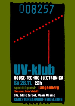 Seit 2000 gibt es den UV-klub und seit Ende 2005 residieren die DJs Eddie Zarook und Steffen Neuert einmal im Monat im Karlstorbahnhof und präsentieren dort ihre ganz eigene Auswahl an hochwertiger Club-Musik. Und diese Auswahl kommt nicht nur in Heidelberg gut an, sondern auch in den Clubs von Russland bis in die Vereinigten Staaten, wo die Herren Zarook und Neuert ebenfalls aktiv sind. Trotzdem bleiben die Beiden der schönen Stadt am Neckar treu. Denn: ?Home is where your heart is!? ? und das schlägt dort, wo die Freunde der anspruchsvollen Tanzmusik zu finden sind, mit denen man immer wieder die besten Club-Partys feiern kann. Kein Wunder, dass der UV-klub inzwischen zu einer führenden Institution der Electronica-Szene in Heidelberg geworden ist: der einzigartige UV-klub-Mix aus Techno und Electronic Beats findet immer den direkten Weg in eure Köpfe, Herzen und Beine.