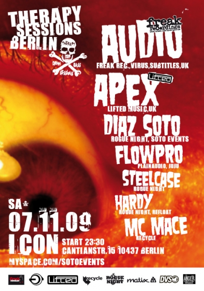 Therapie gefällig? Soll Wunder bewirken, nur mit welcher Musik erreicht man das ultimative Wohlbefinden? ?Rogue Night? Berlins moderne Apotheke des 21. Jahrhunderts präsentiert Euch zusammen mit dem Anger Management ein Therapiestündchen der ganz besonders bösen Art. Das weltweit tätige und höchst erfolgreiche Party-Label ?Therapy Sessions? aus dem Hause Dylan & Robyn Chaos macht das erste Mal im berliner Icon halt. Arzneimittel werden Dark-Step, Amen-Gebretter, düstere Melodien, zerhäckselte Beatz & raveartige Bässe sein! Abgerundet wird das Spektakel mit Visuals, passender Deko und weiteren kleinen Überraschungen. Ein Fest für alle 4 Sinne, diesmal mit Audio (UK), Apex (UK) und den Locals Diaz-Soto, Flowpro, Hardy und Steelcase. Das solltet ihr Euch rot im Partykalender eintragen! www.myspace.com/sotoevents