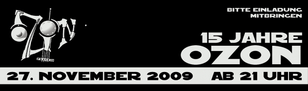 15 Jahre Ozon - natürlich möchten wir jetzt nicht viel verraten aber wie jedes Jahr möchte das Ozon eins drauf setzen. Das Fünfzehnjährige wird am Donnerstag den 26.11.09 mit einer bekannten Pforzheimer Band die Artgenossen ab 21h starten, der Freitag und Samstag wird eine Überraschung bleiben. Diejenigen, welche mitfeiern möchten, können ihre Einladung ab sofort im Ozon abholen ohne Einladung wird kein Eintritt möglich sein.