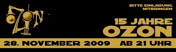 15 Jahre Ozon - natürlich möchten wir jetzt nicht viel verraten aber wie jedes Jahr möchte das Ozon eins drauf setzen. Das Fünfzehnjährige wird am Donnerstag den 26.11.09 mit einer bekannten Pforzheimer Band die Artgenossen ab 21h starten, der Freitag und Samstag wird eine Überraschung bleiben. Diejenigen, welche mitfeiern möchten, können ihre Einladung ab sofort im Ozon abholen ohne Einladung wird kein Eintritt möglich sein.
