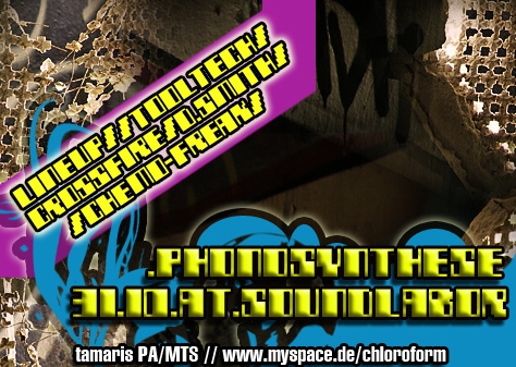 wer an Halloween keine lust hat auf den ganzen stress und lieber die familiäre Underground Atmosphäre bevorzugt begibt sich auch an einem Tag wie diesem nach Ludwigshafen ins Soundlabor ! Denn dort heisst es auch diesmal wieder Phonosynthese - mit sattem Sound und treibenden beats lassen wirs mal wieder so richtig Kesseln im hinteren Kesselraum !...Hinter den Decks erwarten euch diesmal TOOLTECH ( Tresor Berlin, Exhaus Trier ), welcher die Labels Labor 51 und Tooltech Records betreibt. Desweiteren sind Crossfire, Chemopfer und D.Smith ebenso mit dabei...Sound Techno, industrial, schranz, brighton Flyer und nfos -> www.myspace.de/chloroform
