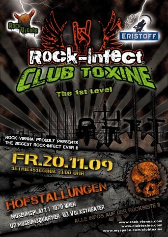 Freitag, 20. November: Der Mond ist noch hell doch bereits im Abnehmen begriffen. Die Wölfe heulen zum RockInfect: Club Toxine, die Raben tragen die Botschaft krächzend weiter und in der ganzen Stadt beginnt es zu rumoren. Emos und Freunde harter Musikstile rotten sich zusammen, viele von ihnen in dunkelschwarz gekleidet. Als untote Kunstwerke wandeln sie ins Museumsquartier um dort schließlich die Hofstallungen zu okkupieren. Was für die Außenstehenden ein düsterer Schauder ist den Protagonisten die hammermäßigste Party Wiens für hemmungslosen Spaß. In der ohnehin schon Schwermetall-belasteten Beschallung schlägt der NDH-Virus mit Neuer Deutscher Härte durch. Die DJs Tiger, Jayy, SkierSky und Fluid injizieren unter anderem Rammstein, Blink 182, The Prodigy, Bullet for my Valentine, Seeed, Billy Talent, Bring me the Horizon, Deichkind, Rise Against, GreenDay, Disturbed, Brokencyde und As I Lay Dying. Von einer Mega Lichtshow hypnotisiert wird das von den Infizierten auf dem riesigen Dancefloor widerstandslos hingenommen. An drei Bars nehmen sie seltene Tränke wie etwa Absinth ein und erfreuen sich leuchtender Shotbecher oder Knicklichter. Während Gerüchte entstehen, dass hinter den Chill-Out-Sofas Naturhochzeiten gefeiert werden, werden Musikwünsche per SMS erfüllt. Das Tor zu einem neuen Partyformat ist geöffnet: Club Toxine. Die Erde bebt.