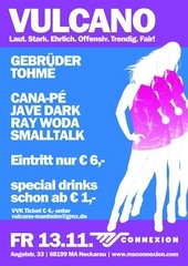 Laut, stark, ehrlich, offensiv, trendig und fair brodelt am FREITAG, den 13. November, auf dem Mainfloor des Mannheimer MS Connexion die Veranstaltungsreihe Vulcano und feuert mit einem explosiven Line-Up hochkarätiger regionaler DJs ein musikalisches Feuerwerk ab.