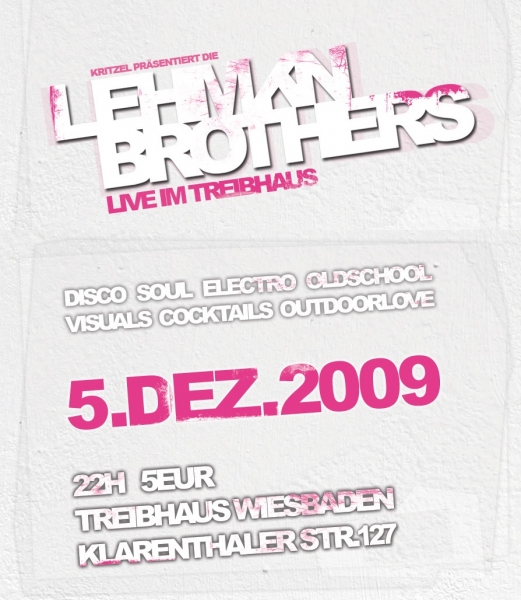 Das Wiesbadener Label KRITZEL präsentiert im TREIBHAUS das DJ/VJ-Team LEHMAN BROTHERS. Im Wohn- und Esszimmer-Ambiente inkl. Tanzboden und Lounge bringen die LEHMAN BROTHERS die Tanzbeine mit Disco, Soul, Oldschool und Electro zum Schwingen. Optisch wird die Partynacht durch leckere "Videohack"-Visuals angereichert.