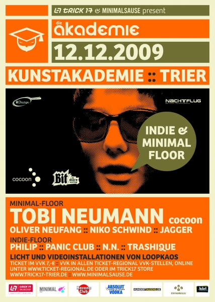 Mit einem hochkarätigen DJ-Sixpack auf zwei Floors kommt ?Die Akademie? zurück in die Europäische Kunstakademie nach Trier. Mit der gekonnten Mischung aus Elektronik und Indie wird ab 22.00h mit Tobi Neumann, Oliver Neufang und vielen anderen gefeiert.