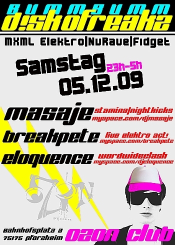 Samstag 05.12.2009 für diesen Abend haben wir euch etwas ganz besonderes zubereitet. Zu Gast ist Dj Masaje aus Ravensburg. Als Stamina Resident im legendären Club Douala sowie bei zahlreichen Acts bekannter Events, darunter zum Beispiel Stuttgart Kaputtraven oder der Streetparade, ist er der NuRave Spezialist und bestens für einen kollektiven Tanzrausch geeignet. Doch alleine hinter den Tellern zu stehen, macht bekanntlich nur halb so viel Spass. Deshalb mit dabei EloQuence, Dj und Mitveranstalter der FR:EAK OUT! Partyreihe. Er wird voll und ganz auf digitale Spielereien verzichten und mit einer frischen Mischung aus Wildstyle/Fidget/NuRave den Hasen zurck in seinen Bau schicken. Als weiteres Special gibt es einen Elektro Live Act von Breakpete, der mit massig Hardware bewaffnet, seine eigens für diesen Abend produzierten Tracks uns um die Ohren knallt. Wer das verpasst ist selber schuld.