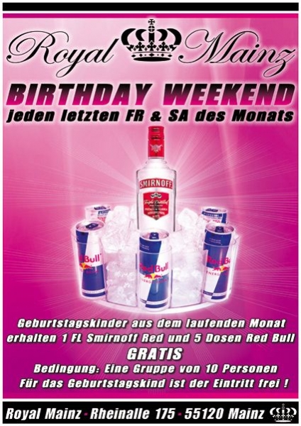 Immer am letzten Samstag des Monats alle Geburtstagskinder der Altersgruppe ÜBER 25 eine Flasche Smirnoff Wodka und 4 Dosen Red Bull FOR FREE!!