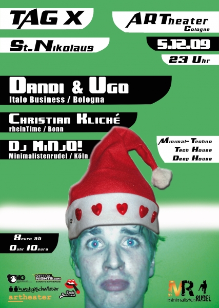 Nachdem wir beim letzten mal das ARTheater mit heißem Italosound á la Uto Karem zum Beben brachten, holen wir uns auch diesmal wieder Unterstützung aus Bella Italia! Wir haben uns keine Geringeren als die Labelheads DANDI & UGO [ Italo Business / Bologna ], von der "Italo Business" Crew ins Boot geholt. Sie werden TAG X - St. Nikolaus mit Ihrem unverwechselbaren Sound und Gespühr für Techno der Extraklasse zu einem schweißtreibenden und knalligen Abend machen.