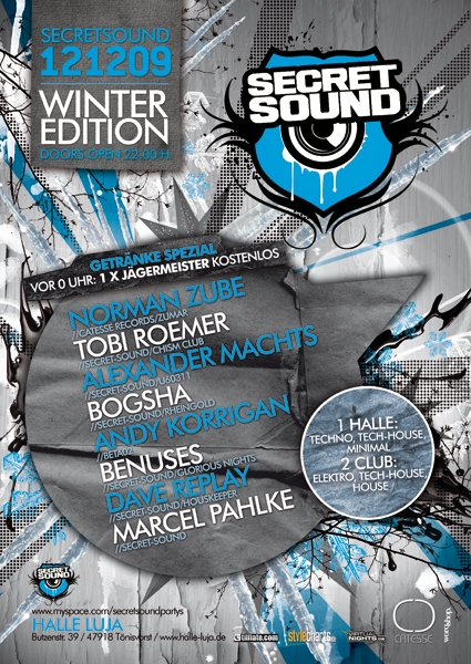 Norman Zube der vor kurzem sein eigenes Label Catesse gegründet hat, Alexander Machts der in den letzten Wochen Stationen wie das Rheingold oder das U60311 bespielten durfte, Bogsha ist auch nach langer Abstinenz endlich wiedermal bei uns, Benuses darf natürlich auch nicht fehlen neben seinen VJ Tätigkeiten ist er auch ein gern gesehener Gast hinter den Plattentellern bei der Secret Sound, Tobi Roemer konnte durch seine Set´s bei der Secret Sound immer wieder beweisen das er die Meute zum ausrasten bringt, Andy Korrigan konnte sich mit seiner eigenen Veranstaltung im Düsseldorfer Beta02 ebenfalls in die Riege der Veranstalter Hocharbeiten und erfolgreich behaupten, Dave Replay darf natürlich auch nicht fehlen gerade erst seinen Geburtstag hinter sich gebracht wird ein Wochenende danach nochmal kräftig weiter gefeiert und natürlich darf der Veranstalter und Resident Marcel Pahlke auch nicht fehlen.