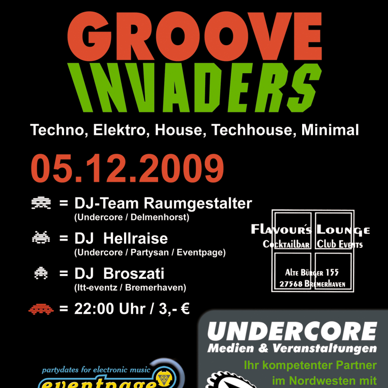 Taucht ein und gebt euch bei extra Licht und Soundinstallationen dem Groove hin auf der Groove Invaders am 05.12.09 um 22:00 Uhr in der Flavour's Lounge in Bremerhaven.