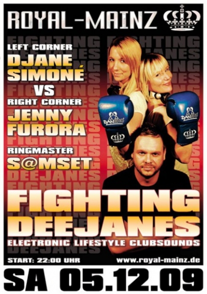 Djane Simoné & Jenny Furora nehmen es mit Royal Resident S@mset auf und werden den Gästen spektakuläre Sounds um die Ohren schlagen. ?Bis die Boxen KO gehen? ist die Devise der neuen Partyreihe der anderen Art.