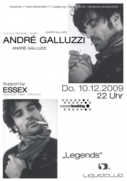 Zur Dezember-Auflage von ?Legends? kommt ein hochkarätiger Gast in den liquidclub: André Galluzzi. Seit Jahren begeistert Galluzzi mit seiner Vielseitigkeit; sein deep kickender Stil reicht von dunklen, spacigen Klängen bis hin zur unbeschwerten Lässigkeit house-orientierter Musik, von minimal-pounding über trippig bis zu fetten Beats. Dabei handelt es sich nicht nur um simple Tracks, sondern um Songs. André Galluzzi spielt keine langweilige Aneinanderreihung stumpfer Drumlines, sondern ausgeklügelte Arrangements. Eingestimmt auf diesen Meister der elektronischen Musik wird das Publikum von Essex. Der überzeugt mit seinem ganz eigenen Erfolgsrezept: Electro. House. Minimal. Tech-House. Electronic Classics. Und das in einer mehr als hörenswerten Mischung. ?Legends? macht auch im Dezember seinem Name alle Ehre. Check it out!