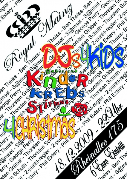 Am 18.12.2009 laden die Djs4Kids und der Mainzer Club Royal Top Acts der Region zum Benefiz-Dance: 7 Djs der Electro Szene werden ihren Namen und ihr Können für eine gute Sache hergeben und hoffen mit uns auf zahlreiche Gäste und somit einen großen Spendentopf für die Deutsche Kinderkrebsstiftung.