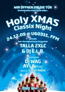 Was früher im Dorian Gray Tradition hatte, soll auch heute auf gebührende Art und Weise fortgeführt werden. Der Technoclub präsentiert mit der Holy Xmas Classix Night genau das richtige Kontrastprogramm zur Stillen Nacht. Talla 2XLC hat dafür gesorgt, dass alle Freunde der elektronischen Musik mit harten Beats und hypnotischen Melodien verwöhnt werden. Die ehemaligen DJs aus Kultlocations wie Dorian Gray, Paramount Park oder Reaktor werden auch diese nie vergessenen Feiertempel für eine Nacht lang wieder lebendig werden lassen. Mit DJ WAG, DJ E.L.B. und natürlich Talla selbst stehen wahre Meister ihres Faches an den Decks, die die ganz besondere Zeit in den Neunzigern hautnah miterlebt und geprägt haben. Als spezielles Highlight wird es eine rare Live-Performance von Ayla geben, bei der Gänsehautalarm garantiert sein wird. Die besten Trance- und Techno-Classics, einzigartige Visuals von LJ Steve und seinem Team sowie eine Partycrowd, die in Deutschland ihresgleichen sucht, werden dafür sorgen, dass die Lichter im U60311 erst am frühen Morgen des Ersten Weihnachtsfeiertages wieder angehen werden.