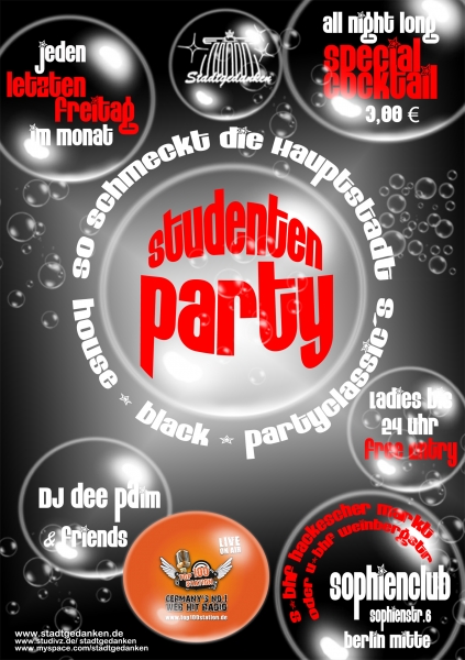 Jeden letzten Freitag im Monat die Studenten Party mit einem Cocktail Spezial für 3? all night long. Auf 2 Floors gibt es House, Black und Partyclassic´s gemixt von DJ DeepAim live on air bei top100station.de und DJ Zoom in der smoking area. Ladies haben bis 24 Uhr free entry
